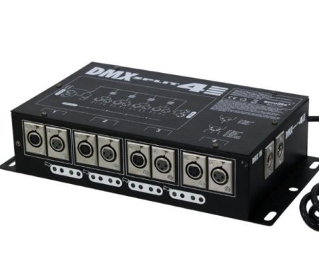 DMX Splitter werden benötigt um DMX Signale wie der Name schon sagt zu splitten, also in mehrere Signalwege zu teilen. Statt der sonst üblichen aufeinanderfolgenden Verbindung von Scheinwerfer zu Scheinwerfer kann eine Sternförmige DMX-Verkabelung erfolgen. Die Booser Funktion regeneriert bzw. verstärkt zusätzlich das DMX Signal.